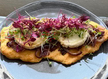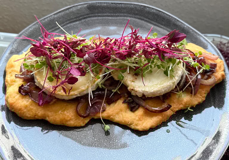 Coca con cebolla caramelizada ,queso de cabra y nuestros frescos brotes de rucula picante y amaranto crujiente con un toque dulce