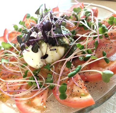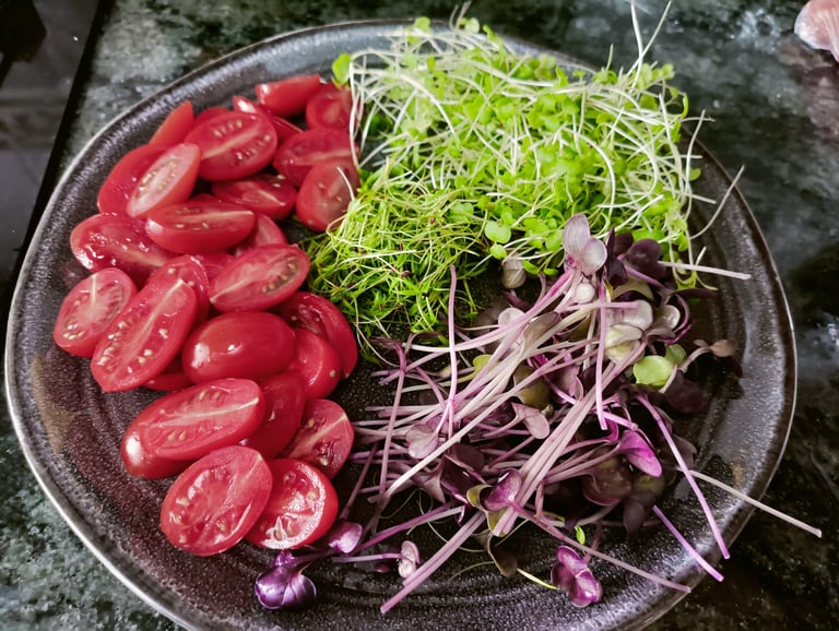 Ensalada de tomates y brotes de remolacha ,daiko y rucula