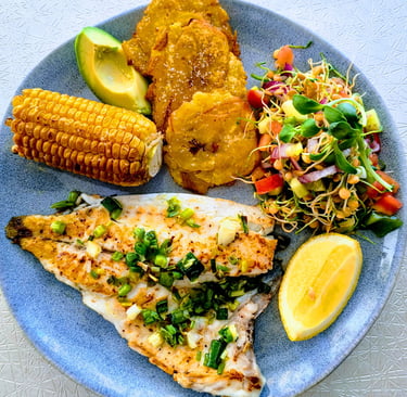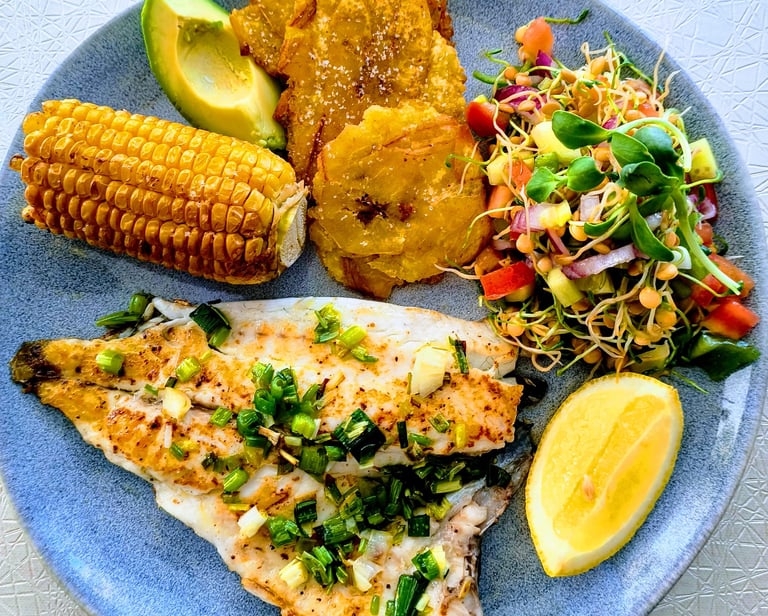 Pescado con ensalada de germinados de lenteja y girasol