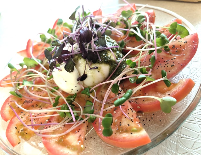 Ensalada de tomate con brotes de remolacha y berro